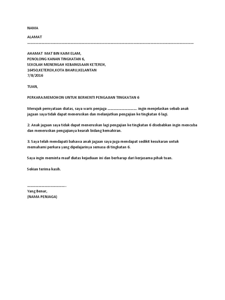 Contoh surat berhenti belajar kolej. Kumpulan Contoh Surat Rasmi Berhenti Belajar Kolej Info Melayu dan Contoh Surat Rasmi Berhenti Belajar Kolej Info Melayu yang bisa anda download secara gratis disini. Azman bin yahya no 9 jalan embun sabak bernam 40000 selangor _____ pengarah kolej matrikulasi selangor kampung kathong 42700 banting selangor 7 julai 2018.